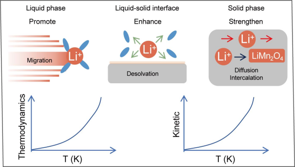 在材料改性的基礎(chǔ)上,青海鹽湖研究所科研人員針對環(huán)境溫度影響電化學(xué)吸附熱力學(xué)和動力學(xué)研究不夠深入的問題,開展了逐步升溫的策略(273.15到328.15 K),探究了溫度如何影響液相中水合離子遷移,固液界面離子脫水合和電子轉(zhuǎn)移,固相中離子擴散等行為的熱力學(xué)和動力學(xué)(圖3)。該研究通過升溫強化了熱力學(xué)和動力學(xué),使吸附速率和吸附容量改善,且通過調(diào)節(jié)反應(yīng)參數(shù)優(yōu)化反應(yīng)速率的策略也可用于電池、催化合能源等領(lǐng)域(Sep. Purif. Technol.355 (2025) 129631)。