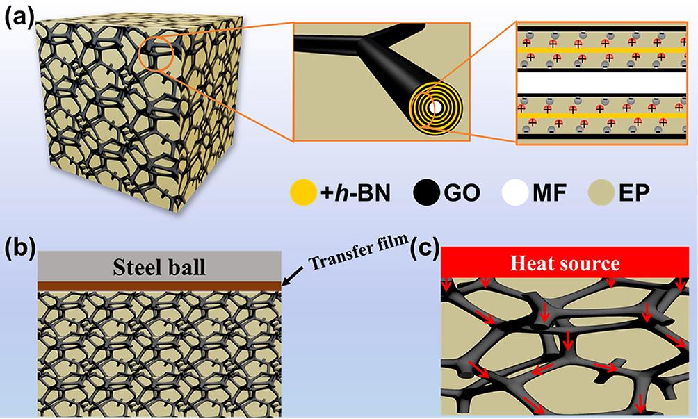 1.(a GBS@polymer復(fù)合材料結(jié)構(gòu)示意圖。GBS@polymer復(fù)合材料(b)摩擦學(xué)和(c)熱傳導(dǎo)機(jī)理示意圖。