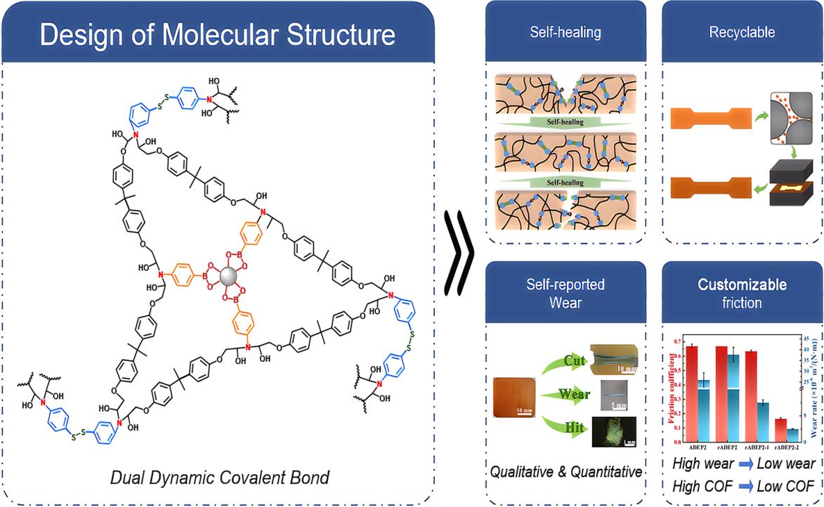 近日,研究人員通過(guò)動(dòng)態(tài)可逆的分子結(jié)構(gòu)設(shè)計(jì),實(shí)現(xiàn)了一種具有自愈合、可回收、自報(bào)告磨損和可定制摩擦的多功能熱固性環(huán)氧樹(shù)脂。基于動(dòng)態(tài)共價(jià)鍵的可逆交換,環(huán)氧玻璃體可通過(guò)熱壓實(shí)現(xiàn)回收和損傷修復(fù),而無(wú)需額外的粘合劑或催化劑。此外,利用動(dòng)態(tài)共價(jià)鍵的可逆性,將具有特定摩擦學(xué)特性的納米填料(氧化石墨烯和聚四氟乙烯)納入回收過(guò)程,以實(shí)現(xiàn)可定制的摩擦系數(shù)和耐磨損性能。不僅如此,研究人員利用二硫鍵的動(dòng)態(tài)性質(zhì),實(shí)現(xiàn)了基于硫自由基的磨損自報(bào)告特性,還研究了磨損時(shí)間與磨損狀態(tài)之間的關(guān)系。