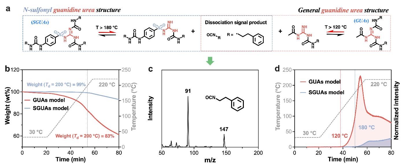 由于胍胺脲鍵具有高度的解離性,聚胍脲材料的熱穩(wěn)定性和尺寸穩(wěn)定性表現(xiàn)較差。針對這一問題,近期報道了一種N-磺?;译褰Y(jié)構(gòu)(SGUA)。相比于GUA結(jié)構(gòu),SGUA結(jié)構(gòu)在保持動態(tài)特性的同時,其解離溫度得到了很大提升,從120 °C提升至180 °C(圖2)。相應(yīng)聚合物材料的熱穩(wěn)定性和尺寸穩(wěn)定性也得到了大幅提升。盡管SGUA結(jié)構(gòu)的解離溫度超過了180 °C,但這種材料在160 °C,20 MPa條件下仍能夠進(jìn)行熱壓成型。網(wǎng)絡(luò)的流變行為表明,這種網(wǎng)絡(luò)不再遵循解離型交換反應(yīng)機(jī)制,而是符合結(jié)合型網(wǎng)絡(luò)交換的特點(diǎn)。相關(guān)成果以“N-Sulfonyl Guanidine Urea to Design Ultrastrong,Stable,and Recyclable Associative Dynamic Polyurea Networks”為題,發(fā)表在Macromolecules(2024,57,23,10938–10947)。