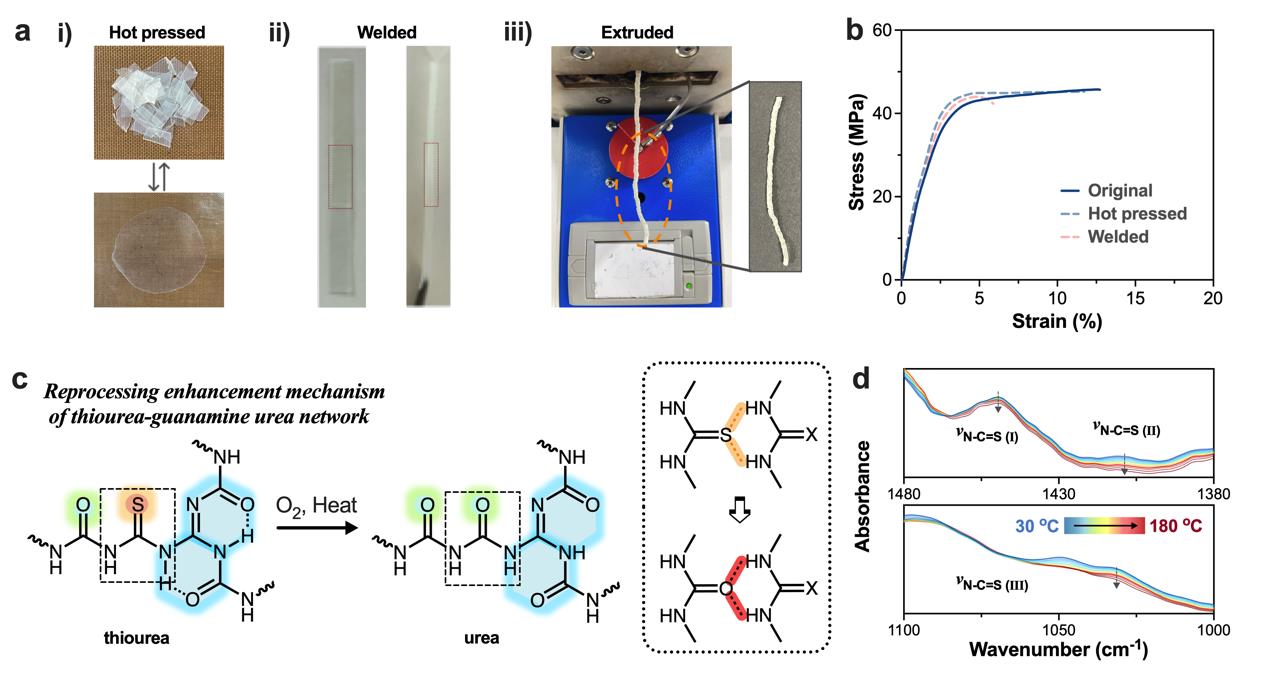 針對可逆交聯(lián)聚合物的連續(xù)再加工問題,研究人員提出了一種胍硫脲雙解離結(jié)構(gòu)的策略。通過胍胺脲鍵和硫脲鍵的雙解離結(jié)構(gòu),實(shí)現(xiàn)了材料的連續(xù)擠出加工。除此之外,胍硫脲網(wǎng)絡(luò)還能實(shí)現(xiàn)多種再加工方式,包括熱壓和焊接(圖3)。進(jìn)一步通過與原料的解交聯(lián)和再交聯(lián)可實(shí)現(xiàn)網(wǎng)絡(luò)的閉環(huán)回收。相關(guān)成果以“Closed-Loop Recyclable and Extrusion Reprocessable Thermosets Enabled by Guanylthiourea Structure”為題,發(fā)表在Advanced Science(2024,11,2410773)。