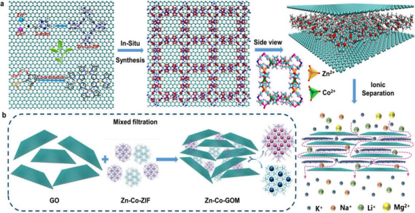 從鹽湖鹵水中獲取鋰資源是最重要的途徑之一。鹵水成分復(fù)雜,Mg2+和Li+水合離子半徑相似,鎂鋰分離難度大。膜分離技術(shù)具有節(jié)能、高效、環(huán)保、操作靈活和成本低等特點(diǎn),可通過精細(xì)調(diào)控膜的孔徑和表面化學(xué)性質(zhì),實(shí)現(xiàn)對(duì)特定離子的選擇性分離。但膜的穩(wěn)定性、耐腐蝕性以及長期使用后的性能衰退仍然是制約膜分離技術(shù)應(yīng)用的主要問題。針對(duì)上述問題,青海鹽湖所鹽湖有機(jī)質(zhì)與硼鉀分離技術(shù)課題組開發(fā)了一種新型的雙金屬有機(jī)框架(MOF)/氧化石墨烯(GO)復(fù)合膜,以提高鹽湖鋰的提取效率。