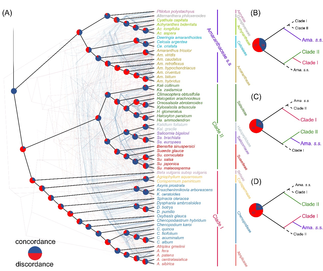 中國(guó)科學(xué)院西北高原生物研究所青藏高原植物適應(yīng)與進(jìn)化研究團(tuán)隊(duì)綜合利用質(zhì)體基因組和全長(zhǎng)ITS序列,重建了廣義莧科的系統(tǒng)發(fā)育關(guān)系。通過(guò)質(zhì)體基因組結(jié)構(gòu)和序列比對(duì)分析,發(fā)現(xiàn)濱藜屬(Atriplex)和藜屬(Chenopodium)存在一段長(zhǎng)約5200 bp的反向互補(bǔ)區(qū)域。適應(yīng)性進(jìn)化分析揭示了8個(gè)基因受到顯著的正選擇作用,這些基因可能在廣義莧科的進(jìn)化中起到了驅(qū)動(dòng)作用。系統(tǒng)發(fā)育結(jié)果表明,傳統(tǒng)藜科為單系類群,建議恢復(fù)其至科級(jí)分類學(xué)水平。對(duì)于廣義莧科的科級(jí)以下分類群,例如藜屬、鹽生草屬(Halogeton)以及豬毛菜亞族(Subtr. Salsolinae)為并系類群,建議通過(guò)建立更多的分類群或?qū)⑥甲澹–henopodieae)和濱藜族(Atripliceae)合并來(lái)解決分類問(wèn)題。核質(zhì)沖突及不完全譜系分選是導(dǎo)致廣義莧科基因樹(shù)系統(tǒng)發(fā)育不一致的主要原因。本研究為廣義莧科的系統(tǒng)發(fā)育關(guān)系提供了新的見(jiàn)解,并指出后續(xù)仍需采取多種數(shù)據(jù)集完善廣義莧科的分類修訂。