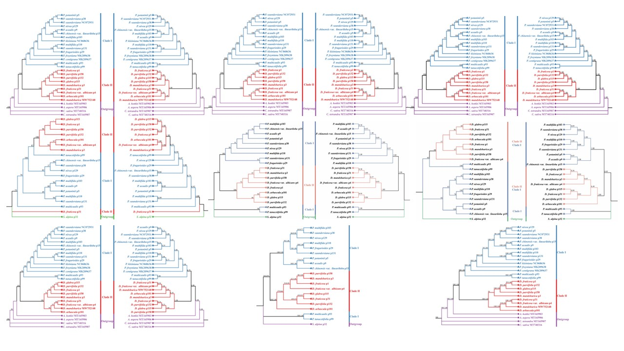 中國(guó)科學(xué)院西北高原生物研究所青藏高原植物適應(yīng)與進(jìn)化研究團(tuán)隊(duì)選擇了19個(gè)委陵菜屬和金露梅屬的全質(zhì)體基因組進(jìn)行Illumina二代測(cè)序,重建了該類群的系統(tǒng)發(fā)育關(guān)系,并研究了他們之間的核質(zhì)沖突關(guān)系。研究結(jié)果表明,這些質(zhì)體基因組的結(jié)構(gòu)、GC含量和基因組成都高度保守,包含84個(gè)CDS、37個(gè)tRNA基因和8個(gè)rRNA基因。此外,所有金露梅屬質(zhì)體基因組的rpl2失去了唯一的內(nèi)含子。比較基因組分析結(jié)果表明,質(zhì)體大小的差異歸因于LSC區(qū)、SSC區(qū)和IRS區(qū)的長(zhǎng)度差異,并且IR區(qū)大部分是保守的,非編碼區(qū)比編碼區(qū)具有更高的差異性。我們篩選了SSR,發(fā)現(xiàn)了7個(gè)高度可變位點(diǎn),可作為潛在的分子標(biāo)記,在闡明委陵菜屬和金露梅屬的屬間關(guān)系上具有一定的參考意義。通過核基因(ITS、ETS)和細(xì)胞質(zhì)基因(質(zhì)體、線粒體)構(gòu)建的系統(tǒng)發(fā)育樹,確定了委陵菜屬和金露梅屬的單系性。我們?cè)谖瓴藢僦袡z測(cè)到了核質(zhì)沖突,這種沖突往往會(huì)導(dǎo)致其單系性發(fā)生變化,我們推測(cè)可能在其進(jìn)化過程中發(fā)生了一定程度的種間雜交或不完整譜系分選事件。本研究通過對(duì)委陵菜屬和金露梅屬的系統(tǒng)發(fā)育比較分析,為該類群之間的分類學(xué)研究奠定基礎(chǔ)。