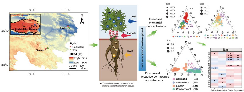 唐古特大黃(Rheum tanguticum)為青藏高原特有的藥用植物,具有瀉下攻積、涼血解毒、逐瘀通經(jīng)、利濕退黃等功效,其關(guān)鍵生物活性化合物為蒽醌類、二蒽酮類以及鞣質(zhì)類化合物。近年來,隨著市場需求的增加,野生資源逐漸減少,栽培唐古特大黃成為重要替代品。然而,栽培品種的品質(zhì)與野生種存在顯著差異,制約了產(chǎn)業(yè)發(fā)展。植物微生物組和礦質(zhì)元素已被證實在藥用植物品質(zhì)形成中具有重要的作用。但是,野生和栽培唐古特大黃微生物組和礦質(zhì)元素對關(guān)鍵生物活性化合物的影響在很大程度上仍未得到研究。