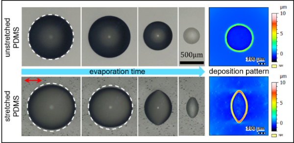 微液滴在未拉伸和拉伸的PDMS表面蒸發(fā)的過(guò)程快照和最終的沉積圖案