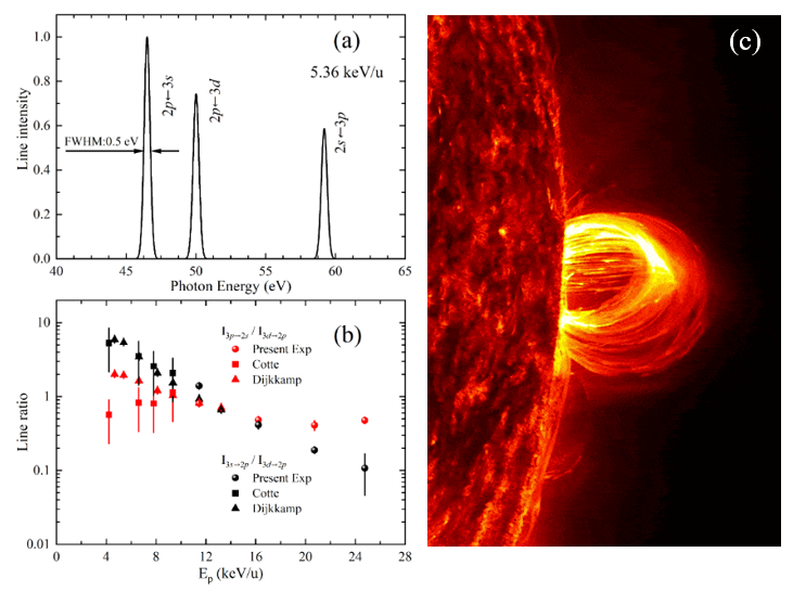 圖:(a-b) 實(shí)驗(yàn)所得N5+與He電荷交換EUV譜線和線強(qiáng)比;(c) 日冕物質(zhì)拋射示意圖
