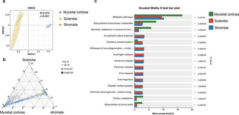 該項研究以題為?Culture-dependent and -independent analyses reveal unique community structure and function in the external mycelial cortices of Ophiocordyceps sinensis?發(fā)表在?BMC Microbiology(中國科學(xué)院二區(qū),IF=4.0)。西北高原所碩士研究生李娜、中國科學(xué)院微生物研究所碩士研究生李佳妮為共同第一作者,西北高原所副研究員邢睿為通訊作者。本研究得到了青海省重大科技專項(項目編號:2023-SF-A5)及“西部之光”人才培養(yǎng)計劃資助。