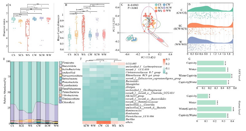 目前,腸道微生物群如何響應(yīng)極端環(huán)境變化的機(jī)制仍不明確。白唇鹿(Przewalskium albirostris)是青藏高原特有的國家一級(jí)重點(diǎn)保護(hù)動(dòng)物,是研究動(dòng)物微生物群對(duì)季節(jié)變化和人類干擾適應(yīng)機(jī)制的理想模型。中國科學(xué)院西北高原生物研究所動(dòng)物生態(tài)與資源保護(hù)研究團(tuán)隊(duì),通過整合 16S rRNA 測序、宏基因組學(xué)與非靶向代謝組學(xué)等多組學(xué)方法,系統(tǒng)解析了白唇鹿在冬季和圈養(yǎng)環(huán)境下的腸道微生物組成、功能潛力及代謝特征。該研究不僅為理解高原特有動(dòng)物腸道微生態(tài)系統(tǒng)的動(dòng)態(tài)變化與適應(yīng)策略提供了重要科學(xué)依據(jù),也從微生物學(xué)視角為瀕危物種的保護(hù)與管理提供了理論支持。