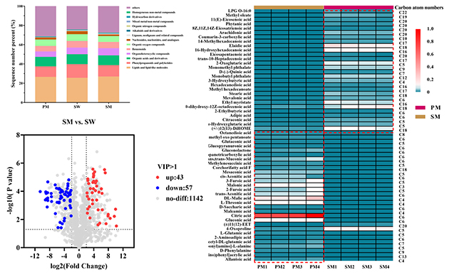 非靶向代謝組學分析共鑒定出1242種代謝物。在扁蓿豆植株甲醇提取物中,短鏈有機酸及其衍生物的相對豐度較高;根際土壤水提物中富含生物堿和黃酮類化合物;而根際土壤甲醇提取物則以長鏈有機酸及其衍生物為主。進一步發(fā)現(xiàn),短鏈有機酸、其衍生物以及黃酮類化合物可能為與扁蓿豆化感作用相關的關鍵候選化感物質(zhì)。