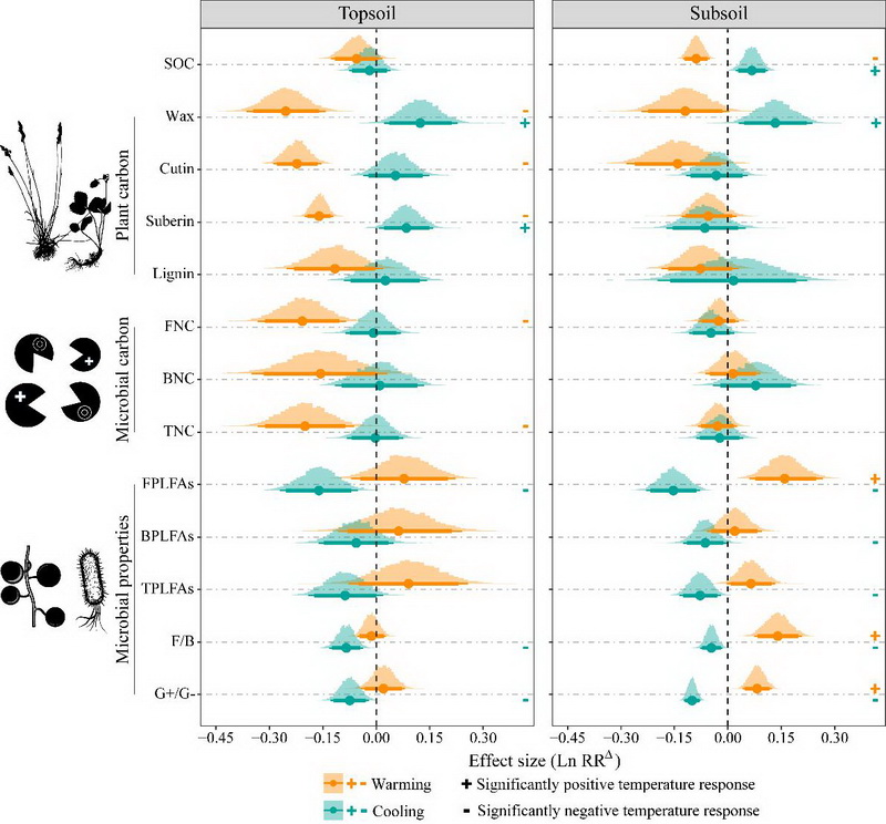 中國科學院西北高原生物研究所高寒生態(tài)系統(tǒng)與全球變化研究團隊依托2007年在青海海北高寒草地生態(tài)系統(tǒng)國家野外科學觀測研究站建立的“山體垂直帶雙向移栽實驗”平臺,基于生物標志物技術,并借助貝葉斯Meta統(tǒng)計分析在估計研究間異質性和合并效應量方面的優(yōu)勢(尤其在納入研究數量較少時)、獨特的后驗分布估計、靈活的參數設置和便利的結果圖形化展示方法等特點,創(chuàng)新性地采用貝葉斯Meta分析方法分析控制實驗數據,對多組處理、對照實驗進行了歸納性總結,進而系統(tǒng)評估量化了增溫、降溫16年后高寒草甸表層(0-10 cm)和亞表層土壤(20-30 cm)有機碳含量的影響因素(包括植物生物量和多樣性、土壤理化性質、植物源碳組分,微生物源碳組分以及微生物群落特性等)的變化及其與有機碳含量的關系。