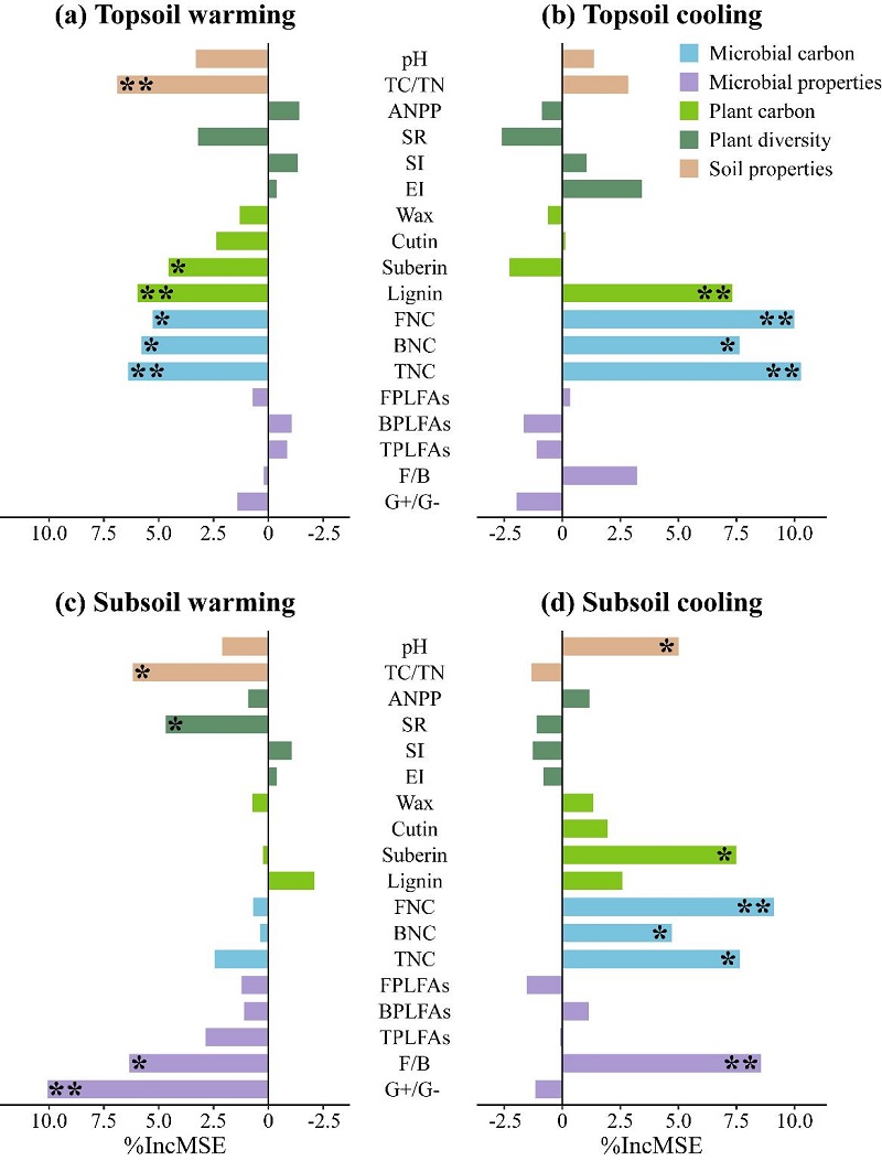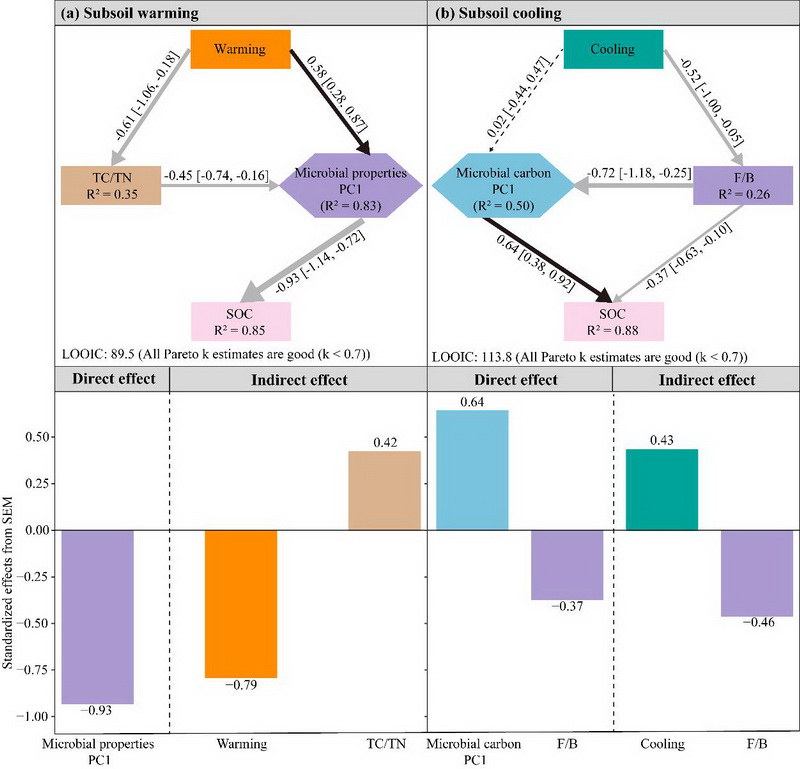 研究發(fā)現,高寒草甸亞表層土壤有機碳對增溫、降溫的響應較表層更為敏感,無論是增溫還是降溫,均未引起亞表層土壤中植物和微生物源碳組分的顯著變化。然而,增溫使真菌與細菌生物量比值(F/B)和革蘭氏陽性細菌與革蘭氏陰性細菌生物量比值(G+/G-)分別增加15.0%和8.6%,而降溫則使其分別降低4.5%和9.6%。進一步分析發(fā)現,增溫主要通過增加F/B和G+/G-直接減少土壤有機碳庫的積累,同時降低土壤碳氮比間接減少亞表層土壤有機碳含量,而降溫則主要通過降低F/B增加亞表層土壤有機碳含量。如果只考慮增溫而不考慮降溫的作用,傳統(tǒng)的增溫控制實驗可能會低估氣候變暖對高寒草地亞表層土壤有機碳庫的消極作用。該研究為更好地解釋和預測未來氣候變化背景下高寒草地生態(tài)系統(tǒng)土壤碳庫的形成與變化提供了新的理論依據。