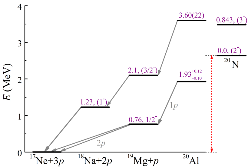 進一步的研究表明,鋁-20基態(tài)通過級聯(lián)的質子—雙質子發(fā)射的兩步過程進行衰變。作為中間態(tài)的鎂-19基態(tài)具有雙質子放射性,它通過同時發(fā)射兩個質子衰變?yōu)槟?/span>-17。鋁-20是實驗上發(fā)現(xiàn)的首例具有“子核”雙質子放射性的三質子發(fā)射核。