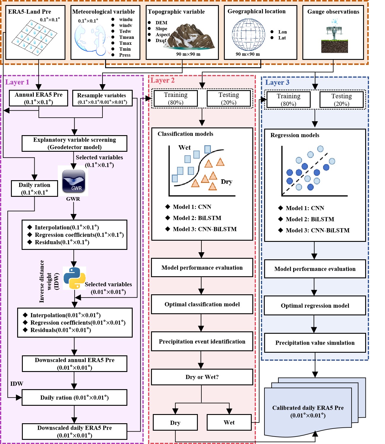 TLIDC技術(shù)框架。TLIDC框架整體分為三部分:降水?dāng)?shù)據(jù)的空間降尺度(表示為L(zhǎng)ayer 1)、降水事件的識(shí)別(表示為L(zhǎng)ayer 2)和降水量的模擬(表示為L(zhǎng)ayer 3)。Layer 1通過GWR模型,提供高空間分辨率的降水?dāng)?shù)據(jù),Layer 2和Layer 3利用構(gòu)建的CNN-BiLSTM模型來提高降尺度后降水?dāng)?shù)據(jù)的準(zhǔn)確性