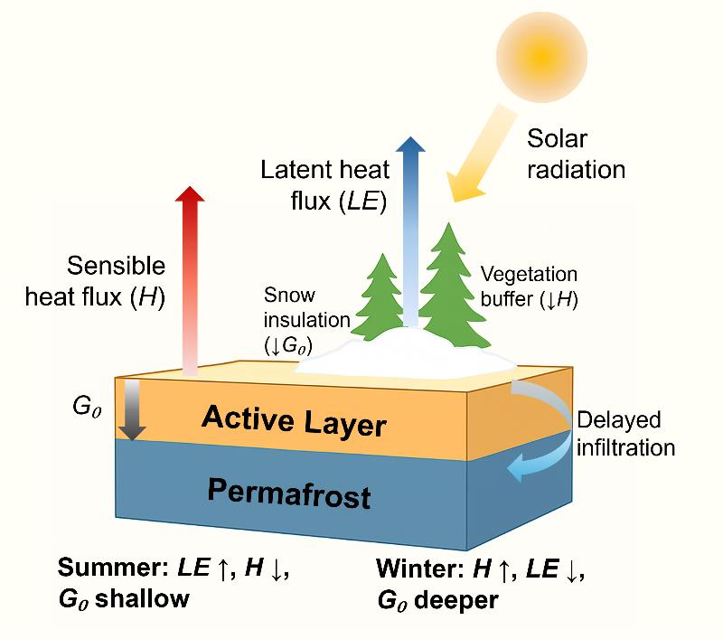 凍土區(qū)季節(jié)性能量通量與地下水文過程示意圖