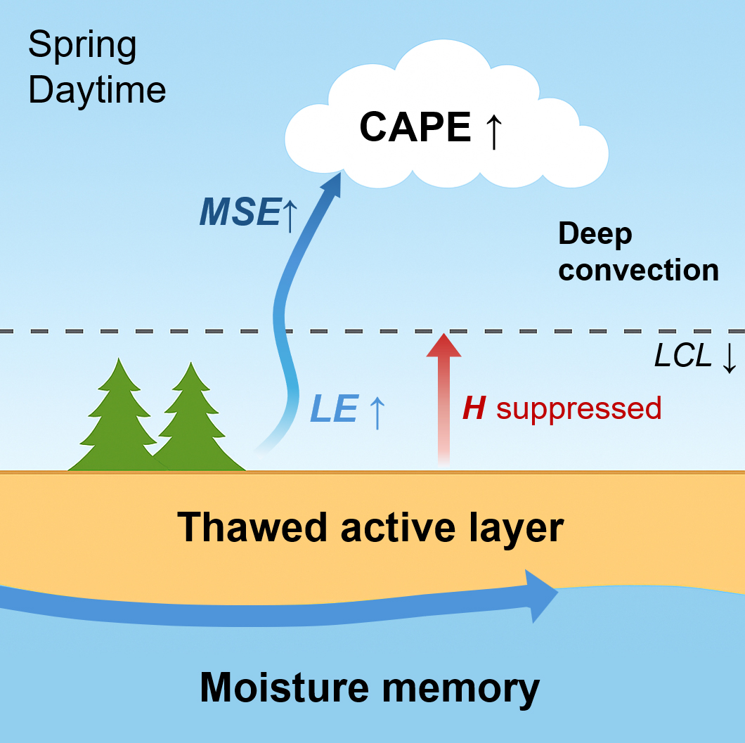 研究團(tuán)隊(duì)依托長(zhǎng)期野外觀測(cè)、遙感反演和過程模擬,完整描繪了“地表能量分配→邊界層演變→季風(fēng)與行星波響應(yīng)”的多尺度反饋鏈條。結(jié)果表明,多年凍土的“凍融記憶”,即凍結(jié)或融化狀態(tài)在季節(jié)間延續(xù)并影響后續(xù)熱量與水分過程,并對(duì)土壤熱物理特性及潛熱/顯熱分配造成影響,共同決定了能量釋放的節(jié)奏與路徑,進(jìn)而影響邊界層穩(wěn)定性、對(duì)流觸發(fā)和大氣遙相關(guān)結(jié)構(gòu)。