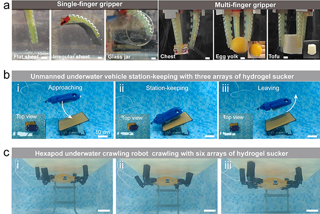 為進一步凸顯非破壞性粘附的實用性,研究人員研制了一款采用液壓驅(qū)動、配備仿生吸盤的水凝膠夾持器,可自適應地操縱各種水下物體,不僅能應對曲面復雜的物體,甚至還能溫和處理蛋黃、豆腐塊等極為脆弱的食品。 此外,研究人員將這類水凝膠吸盤陣列結(jié)構(gòu)集成到水下無人航行器的腹部和六足機器人的足端,從而賦予其水下操控物體、定點停留及表面爬行等特殊功能,為復雜海洋環(huán)境場景中的應用提供了高適形、可逆、低損的粘附手段。