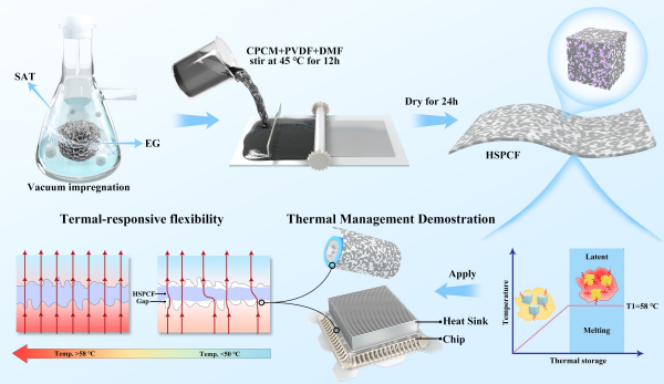 青海鹽湖所溶液結(jié)構(gòu)與界面課題組研究團(tuán)隊(duì)以三水醋酸鈉(SAT)作為相變材料,多孔膨脹石墨構(gòu)建封裝空間,設(shè)計(jì)了一種無機(jī)相變薄膜。通過膨脹石墨在不同方向?qū)娱g交聯(lián)形成3D多孔支撐骨架構(gòu)建“熱橋”,實(shí)現(xiàn)熱量多維度傳遞。并且當(dāng)電子器件臨界熱失控,相變薄膜主動(dòng)儲(chǔ)存熱量,該“熱傳導(dǎo)+熱吸收”的雙重?zé)峁芾頇C(jī)制有效緩沖電子器件瞬時(shí)熱通量,且PVDF的引入使相變薄膜獲得熱誘導(dǎo)柔性、良好的阻燃與電絕緣性能。研究結(jié)果使熱失控電池模塊溫度降低10?℃,CPU表面溫度降低20?℃。