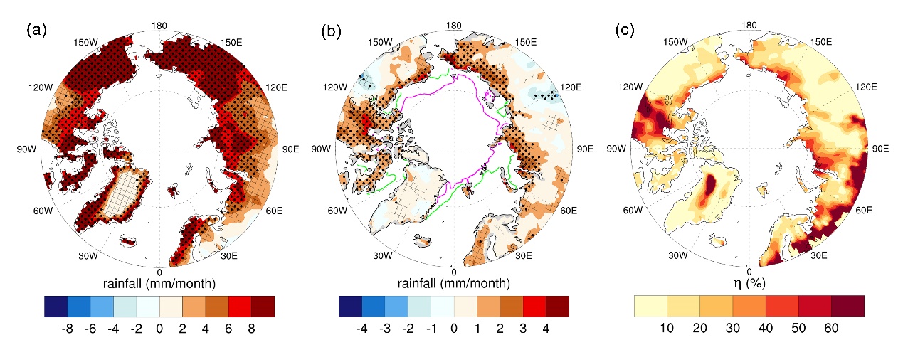 全強迫(a)和僅海冰消融強迫(b)下的北極陸地夏季降雨量的多模式平均響應,(c)海冰消融對降雨變化的貢獻率