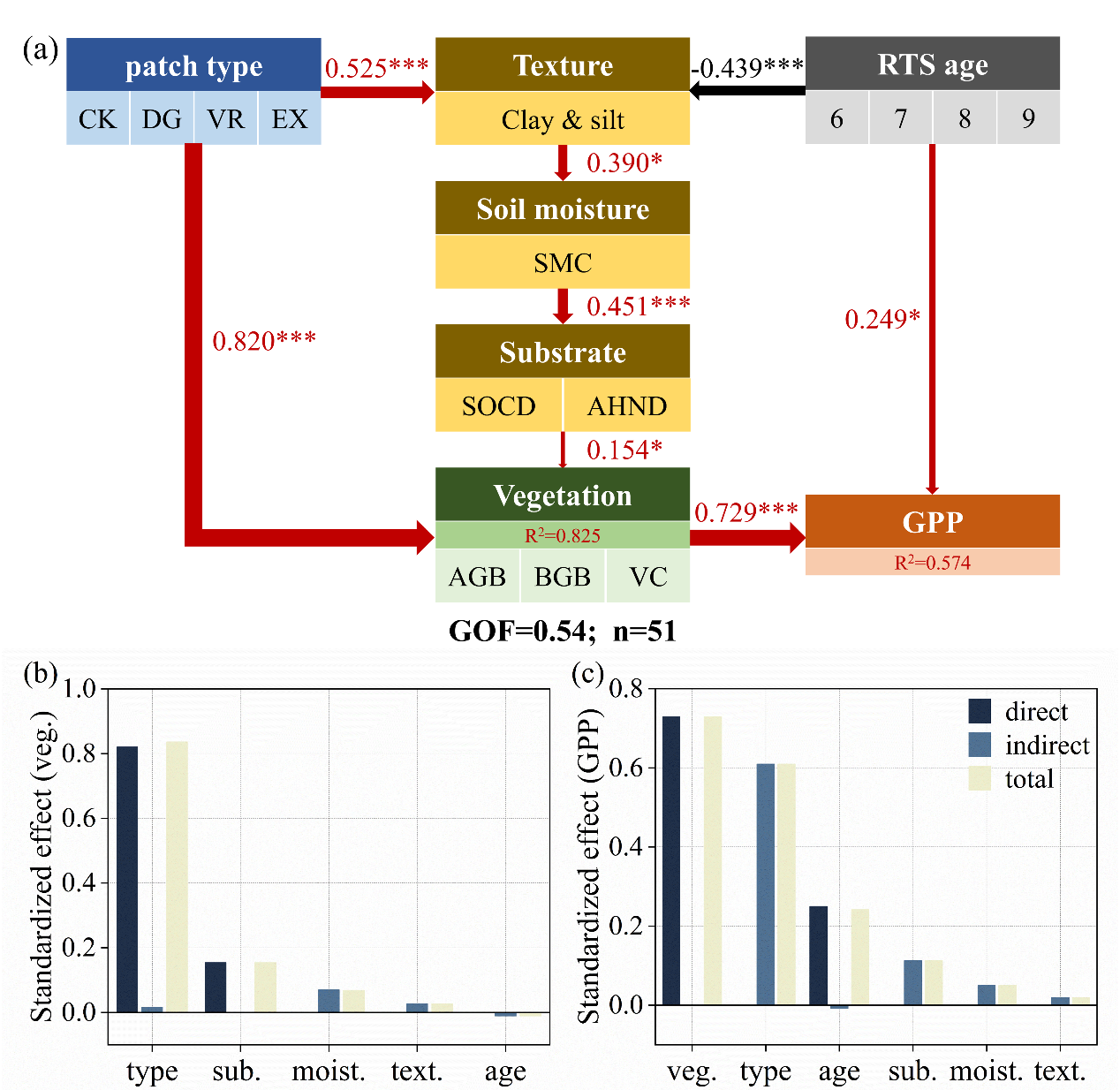 偏最小二乘路徑模型結(jié)果表明,熱融滑塌主要通過“土壤質(zhì)地-水分-基質(zhì)-植被-GPP”路徑影響青藏高原生態(tài)系統(tǒng)功能。其中植被對GPP的直接控制最強(qiáng),滑塌年齡次之,土壤過程則更多通過調(diào)節(jié)群落結(jié)構(gòu)間接作用影響GPP。因此,在評估熱喀斯特地貌的碳效應(yīng)時,應(yīng)將滑塌地表類型及年齡組成納入考量。