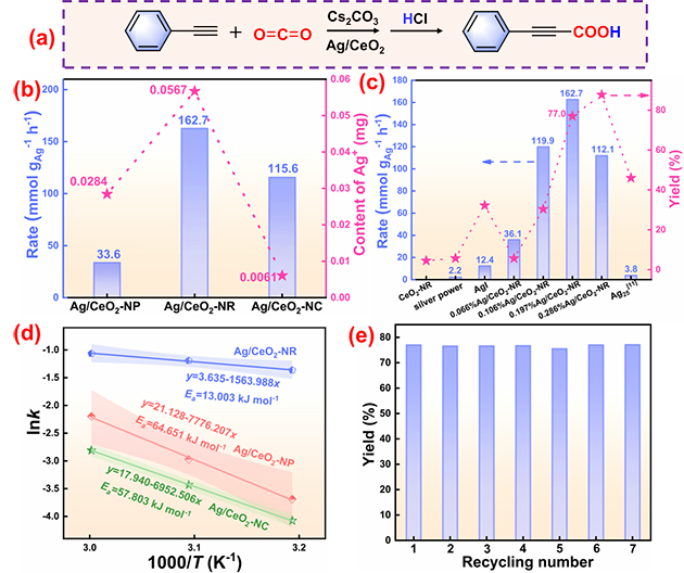圖1. CO2與端炔羧化反應(a)的催化活性(b、c)、活化能(d)和循環(huán)性能(e)研究