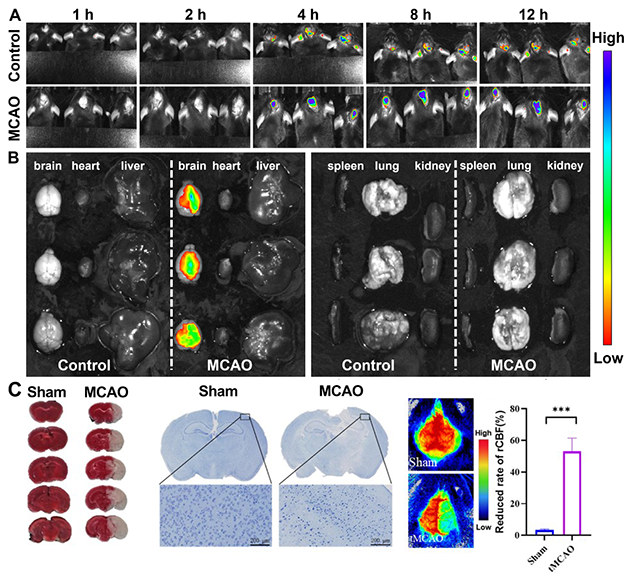 圖2. 卒中動物模型的構(gòu)建及探針成像效果評估