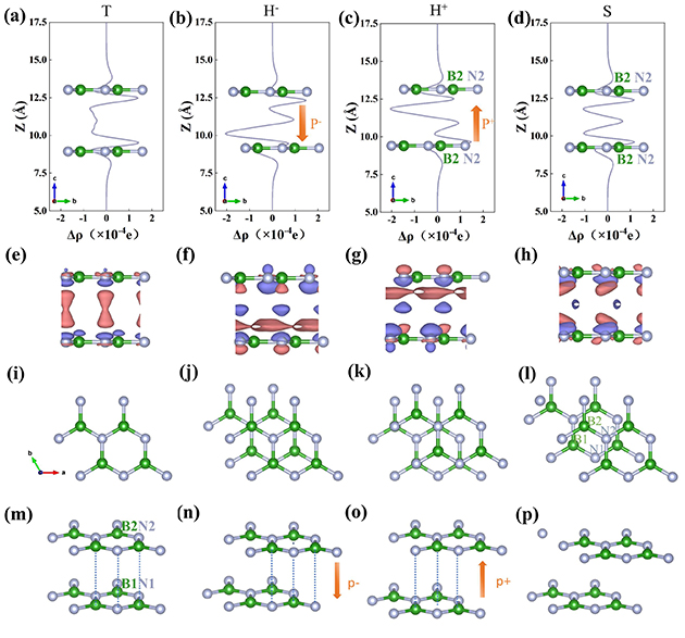 圖1.雙層h-BN的四種構型對應的一維(a-d)和三維(e-h)差分電荷密度以及構型的頂視(i-l)和側(cè)視圖(m-p)。