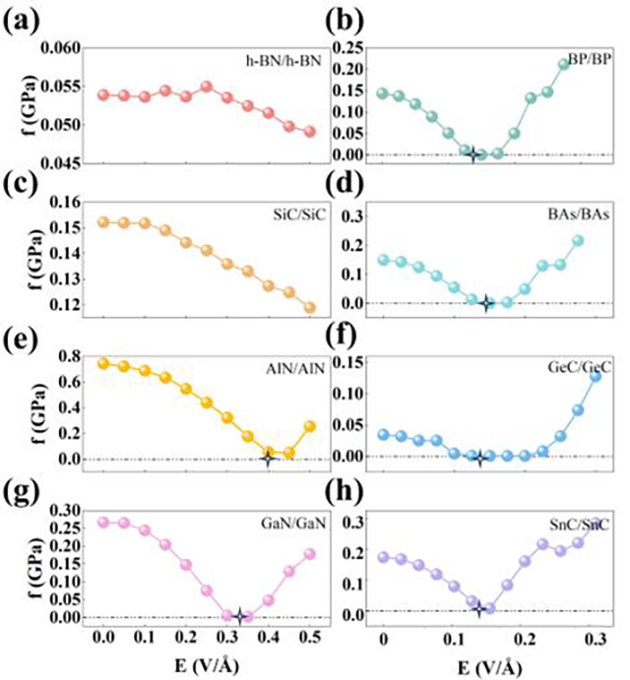 圖3. 8種類h-BN材料的摩擦力f與外電場E的關系。