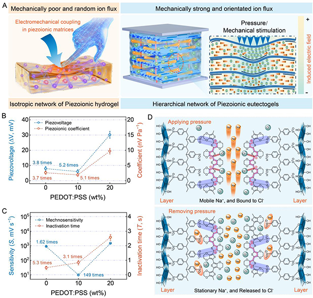 課題組通過機械訓(xùn)練構(gòu)建層級互穿的納米纖維網(wǎng)絡(luò)結(jié)構(gòu),不僅實現(xiàn)了多尺度能量耗散機制強韌化了力學(xué)屬性,而且為壓力驅(qū)動的離子流提供了定向遷移通道,降低了離子壓電水凝膠中未受約束的離子遷移必須克服三維網(wǎng)絡(luò)的空間阻力。分子尺度上,在離子壓電凝膠網(wǎng)絡(luò)中引入PEDOT:PSS作為Na+和Cl–的電荷補償受體,產(chǎn)生離子?電子的電荷補償反應(yīng),實現(xiàn)非對稱陰、陽離子傳輸動力學(xué)。如圖1所示,在施加壓力下,Cl–作為PEDOT骨架上空穴的主要電荷補償載體可以有效延伸電子傳輸鏈以加速Na?遷移,從而放大了Na+與Cl–之間的遷移率差,產(chǎn)生敏感的離電響應(yīng)電壓;而當(dāng)壓力釋放時,PSS鏈上–SO3–基的Na+鍵合位點被激活,可有效阻礙Na+逆向遷移,增強離子失活動力學(xué),產(chǎn)生可持續(xù)的離電效應(yīng)。