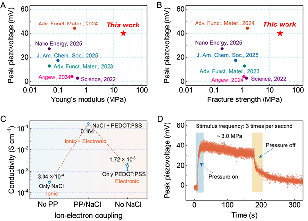 中國科學(xué)院蘭州化學(xué)物理研究所潤滑材料全國重點實驗室摩擦物理與傳感課題組,通過優(yōu)化離電凝膠力學(xué)性能與離電性能的無縫兼容性,利用“分子?結(jié)構(gòu)正交設(shè)計”策略,首次在力學(xué)強韌的凝膠中實現(xiàn)了連續(xù)、穩(wěn)定的離子壓電效應(yīng)。