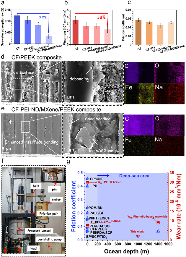 模擬深海高壓環(huán)境的原位摩擦磨損測試結(jié)果表明,這種有機(jī)/無機(jī)協(xié)同的界面設(shè)計(jì),能顯著提升復(fù)合材料在極端環(huán)境下的耐磨損性能(圖3)。在模擬1000米深海壓力下,制備復(fù)合材料的摩擦系數(shù)與磨損率均為目前文獻(xiàn)報(bào)道的同類材料最低值,為解決深海運(yùn)動(dòng)部件材料損傷防護(hù)與應(yīng)用提供了新思路。