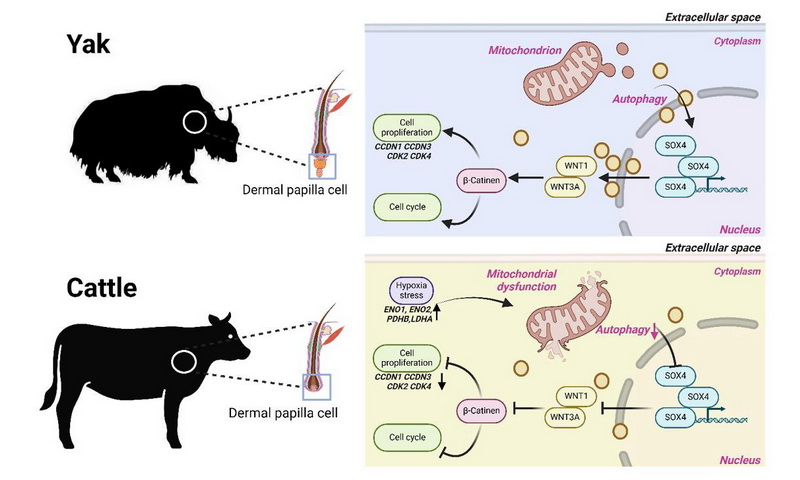 研究團(tuán)隊(duì)進(jìn)一步利用ATAC-seq與ChIP-qPCR發(fā)現(xiàn)了轉(zhuǎn)錄因子SOX4可直接結(jié)合WNT1與WNT3A基因的啟動(dòng)子區(qū)域,且這一結(jié)合對(duì)基因的轉(zhuǎn)錄激活作用通過雙熒光素酶實(shí)驗(yàn)得到驗(yàn)證。SOX4的表達(dá)受自噬水平調(diào)控,激活自噬可挽救SOX4抑制劑對(duì)DP細(xì)胞增殖的抑制作用。該調(diào)控通路在牦牛體中表現(xiàn)出更強(qiáng)的信號(hào)活性,通過促進(jìn)DP細(xì)胞周期進(jìn)程、增強(qiáng)細(xì)胞增殖能力來維持毛囊穩(wěn)態(tài);同時(shí),該通路還能改善線粒體結(jié)構(gòu)完整性以抵御氧化應(yīng)激,從而可能促進(jìn)毛囊生長(zhǎng),系統(tǒng)性增強(qiáng)牦牛對(duì)高原寒冷環(huán)境的生存適應(yīng)能力??傊芯繄F(tuán)隊(duì)從單細(xì)胞水平解析了牦牛毛囊適應(yīng)高原寒冷環(huán)境的分子特征,為理解動(dòng)物對(duì)高原極端環(huán)境的適應(yīng)機(jī)制提供了重要基礎(chǔ)數(shù)據(jù)。