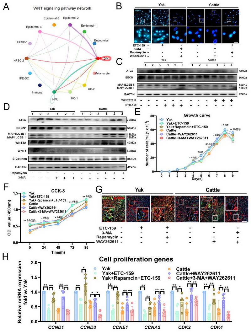 文章代表圖:DP細(xì)胞中自噬與增殖的相互作用由WNT/β-Catenin通路介導(dǎo)。(A)DP細(xì)胞單細(xì)胞數(shù)據(jù)中WNT信號(hào)通路的細(xì)胞相互作用圖。(B)不同處理后牦牛和普通牛DP細(xì)胞的MDA活細(xì)胞染色。(C)牦牛、牦牛+ETC-159、普通牛和普通牛+WAY262611處理組DP細(xì)胞中ATG7、BECN1和LC3I/II的蛋白質(zhì)印跡分析(n=3)。(D) 牦牛、牦牛+3-MA、普通牛和普通牛+雷帕霉素處理組DP 細(xì)胞中ATG7、BECN1、LC3I/II、WNT3A、WNT1和β-Catenin的蛋白質(zhì)印跡分析(n=3)。(E-F)牦牛、牦牛+ETC-159、牦牛+雷帕霉素+ETC-159、普通牛、普通牛+WAY262611和普通牛+3-MA+WAY262611組DP細(xì)胞的生長(zhǎng)曲線(n=9)和CCK-8檢測(cè)結(jié)果(n=4)。(G)不同處理組牦牛和普通牛DP細(xì)胞體外培養(yǎng)后PCNA和MKi67的代表性免疫熒光圖像(n=8)。(H)實(shí)時(shí)熒光定量PCR檢測(cè)細(xì)胞增殖相關(guān)基因CCND1、CCND3、CCNE1、CCNA2、CDK2和CDK4的mRNA表達(dá)情況(n=6)