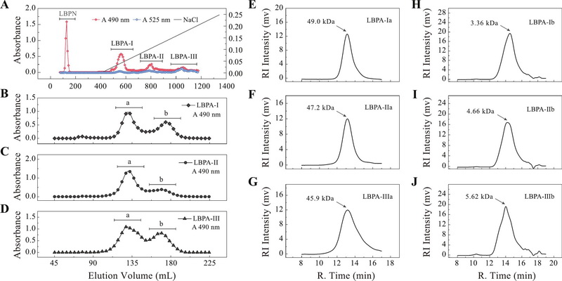 圖1 枸杞果膠組分及其6個亞組分的分離純化與均一性檢測色譜圖