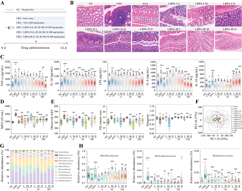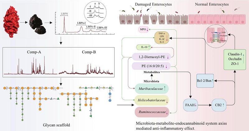 在慢性束縛壓力誘導的小鼠腸道炎癥模型中,活性最優(yōu)的果膠組分(LBPA-III,100 mg/kg.bw)可顯著減輕結腸組織損傷,恢復細胞因子平衡(如TNF-α水平降低、白介素IL-10水平升高),并抑制中性粒細胞浸潤。機制層面,LBPA-III通過重塑腸道菌群結構(如降低Helicobacteraceae豐度、升高Muribaculaceae豐度)、下調促炎脂質代謝物(如1,2-dierucoyl-PE)水平,以及調控內源性大麻素系統(如CB2水平升高、FAAH水平降低)發(fā)揮抗炎作用。上述研究揭示,枸杞果膠AG-II與RG-I–AG-II這種獨特的結構范式,通過“超分子偽降解”機制協同調控腸道菌群,并激活“腸道菌群-代謝物-內源性大麻素系統”軸,從而高效抑制腸道炎癥。