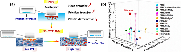 圖2. 泡沫鎳-聚四氟乙烯互穿相復(fù)合材料磨損機制及性能