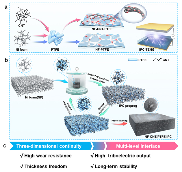 研究人員還研究了無機填料引入對泡沫鎳-聚四氟乙烯互穿相復(fù)合材料性能的增強機制,結(jié)果表明,碳納米管在三維微米泡沫鎳表面形成納米網(wǎng)狀結(jié)構(gòu),促進了界面應(yīng)力傳遞與熱量耗散,顯著提升了力學強度與導(dǎo)熱性能。得益于泡沫鎳與碳納米管形成的三維微/納網(wǎng)絡(luò),復(fù)合材料輸出電流提高至1.5μA,是純聚四氟乙烯的30倍。摩擦起電響應(yīng)長效穩(wěn)定,與不同摩擦副具有普適性,展示了互穿相復(fù)合材料具備優(yōu)異導(dǎo)電特性,可作為高效能量收集的摩擦電材料。相關(guān)研究結(jié)果發(fā)表在Small(2025, 21(5):2409607)上。