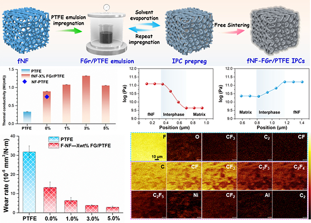 針對泡沫金屬與聚四氟乙烯異質(zhì)界面結(jié)合弱的問題,研究人員采用氟硅烷偶聯(lián)劑對泡沫鎳三維連續(xù)界面進行液相氟化改性,同時在基體中引入少量氟化石墨。結(jié)果表明,界面-基體“雙氟化”的設(shè)計有效增強了泡沫鎳與聚四氟乙烯之間的界面結(jié)合,從而抑制外力拉伸時的變形與裂紋擴展;少量氟化石墨的引入增強了PTFE連續(xù)相的硬度、模量,使得雙連續(xù)相復(fù)合材料的導(dǎo)熱系數(shù)提升至1.3 W/(m·K)。得益于由聚四氟乙烯、鎳磨屑與氟化石墨在金屬配副表面形成的復(fù)合摩擦轉(zhuǎn)移膜,進一步改善了復(fù)合物的摩擦學性能,磨損率下降90.7%。相關(guān)研究結(jié)果發(fā)表在Composites Part B: Engineering(2025: 112816)上。