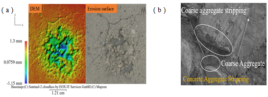 風(fēng)沙流速為30 m/s,風(fēng)沙攻角為90°,磨蝕時(shí)間為8 min時(shí)混凝土磨蝕試件的微觀形貌分析:(a)運(yùn)動(dòng)結(jié)構(gòu)重建(SfM)獲得三維表面形態(tài);(b)掃描電鏡(SEM)二維表面分析