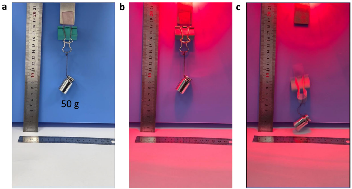 3. 響應(yīng)速度:光照觸發(fā)脫黏在幾秒內(nèi)即可完成,真正實現(xiàn)了用之即黏,取之即脫。正如下圖中所示,研究團隊演示了該材料在不銹鋼基板上的光熱響應(yīng)行為,初始狀態(tài)下可穩(wěn)定懸掛50g重物,近紅外光照后因黏附性能切換而黏附失效。