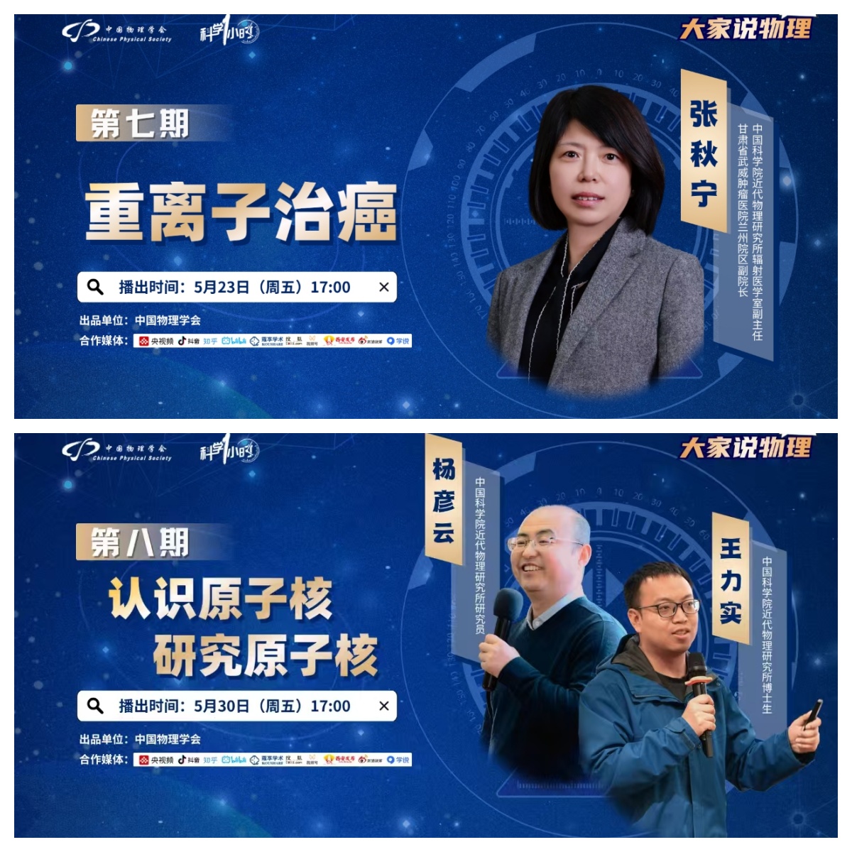 在全國科技周期間,受中國物理學會邀請,近代物理所張秋寧研究員、楊彥云研究員及王力實博士共同參與了“科學一小時”科普欄目的錄制,開展了題為《重離子治癌》和《認識原子核,研究原子核》的線上科普課程。