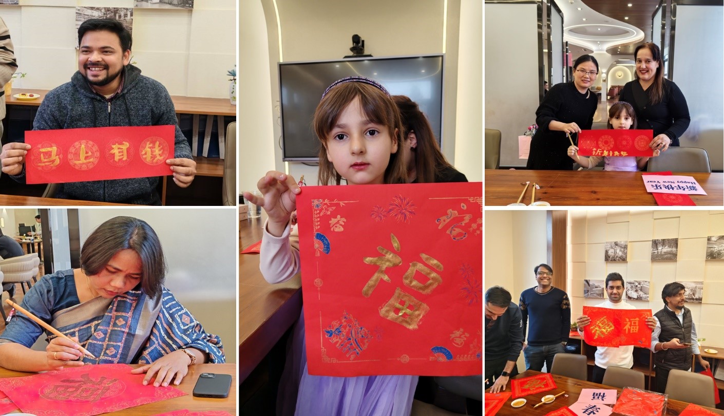 活動(dòng)精彩紛呈,在充滿墨香的中國(guó)傳統(tǒng)書法體驗(yàn)區(qū),外籍人員及家屬饒有興致地駐足打卡 “福字”、“對(duì)聯(lián)”書寫活動(dòng),一對(duì)對(duì)春聯(lián)、一個(gè)個(gè)福字躍然紙上,互道新年的美好祝福,近距離體驗(yàn)中華傳統(tǒng)文化魅力。