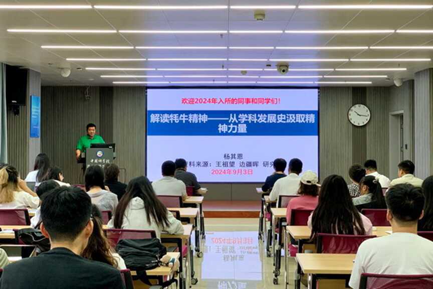 楊其恩作了“解讀牦牛精神——從學(xué)科發(fā)展史汲取精神力量”專題報(bào)告,報(bào)告從回顧研究所的發(fā)展歷程為切入點(diǎn),向大家講述了“牦牛精神”蘊(yùn)含的深刻意義和背后歷經(jīng)曲折、卓越堅(jiān)守、不計(jì)報(bào)酬、但求貢獻(xiàn)的過往,希望作為“國家隊(duì)”、“國家人”的新生力量,大家能夠保持真誠與謙卑,抱利他之心、行利他之事,能夠心系“國家事”、肩扛“國家責(zé)”,面向國家需求、結(jié)合個(gè)人興趣,承先生前輩之創(chuàng)造、開科研范式變革之新局,做“牦牛精神”忠實(shí)地踐行者。